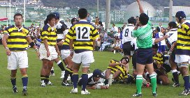 交代、村上→吉村(熊本西A)2001年度の大体*立命戦を裏返したような試合内容。体大FWがスクラム・モールで立命FWをねじ伏せた印象。関東のTOPチームならBKで返せるが、関西リーグはFWの優劣がそのまま勝敗に直結。国際レベルの外人コーチの指導は時間が短すぎて未消化(彼らのラグビー理論は日本代表レベルでも消化できるかどうか?)。加えて練習中止期間がありチーム力の低下が完封負けした原因か。それにしても逆転は無理と判断したのか馬場の入替など勝負を捨てたのは不可解。スポーツ新聞の大体大・坂田監督のコメントは「今日はやるだろうとなぁ」と自信を持って臨んだとある。人口芝とカンタベリー協会へ留学して学んだ練習方法を取り入れた効果ということである。
