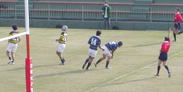 前5分、近大・渡海谷パスインターセプトからカウンター。Bで追いつくも近大フォロートしてトライ