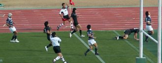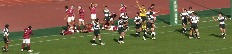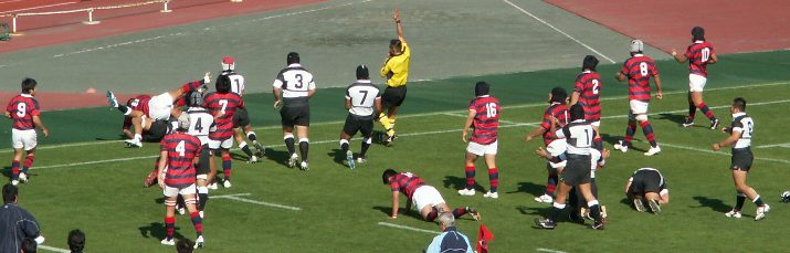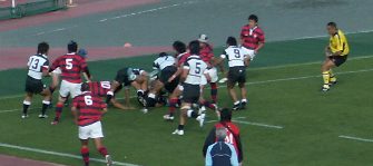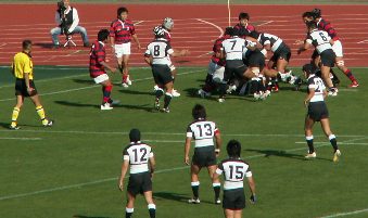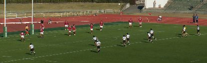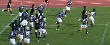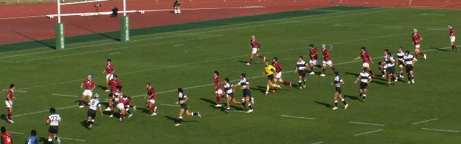 京産は前半PGを狙えるところでゴール前スクラムを選択、力勝負にでるも体大に封じ込まれた。また、スキをつこうとしているのか、あわてる必要がないのにプレーに落ち着きがなく自ら追い込んでいた印象である。(PKから速攻しかけるもキックボールをおとしてノックオン、ドロップアウトチャージされる) 大体大PG失敗から失トライまで1分だった。ゲームコントロールできる主将の欠場が響いた。しかし、地力は大体大の方が上のようであった。