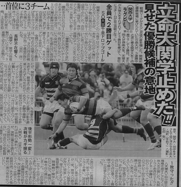 開幕3連勝の関学が有利とみられたが立命が開始3分でスクラムサイドをついてトライ。関学スクラムはコラプシンググ多発でペースつかめず。立命FWの重圧をうけたようで、BKにまわすもディフェンスを大きく崩すだけの組織力・手数もなかった。勝負を決めたのは後半26分ごろの立命ドロップゴールによる得点であった。