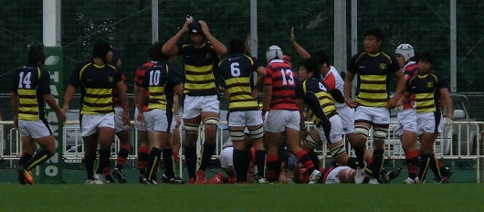 前半見て後半は第一グランドに移動。京産が先制し、前半32分後に山下のトライで13−12とリードするも反則から自陣に攻め込まれて失点。後半崩れてしまって点差がついた。京産は得点力がないのだからキック精度を高めて確実に加点できる状態が望ましい。