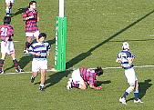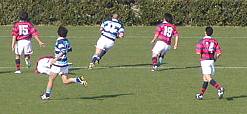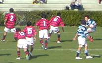 前半10分、中央が先制TG(A)、京産はその後相手陣にはいりこみモール中心に攻勢22分T(B)、39分T(C)をあげて(10−10)同点で前半終了。後半にはいると中央BKが切れ味とスピードで京産BKを翻弄、開始から五分おきに5連続トライを奪う(Dは後半1本目、Eは2本目)猛攻で主導権を握る。京産は30分チャージしたボールをインゴールで押え(G)1トライ返すにとどまった。