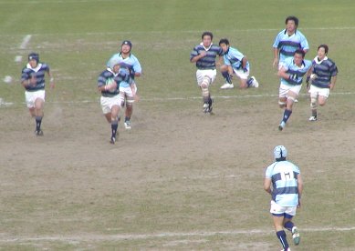 関東は前半FW中心の攻め。パワフルな縦攻撃で同大を押し気味に試合を進めるが、同大は大きな破綻もなく個人技に優れるBKが関東ディフェンスを破りトライを奪う展開。