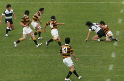 ラックからのプレッシャーも強く関西テンポの配給では通用せず満足にパスがとおらない。アタックは前半30分過ぎからテンポを速めたようだが、付け焼刃では機能せず、デフェンスも内に切り込まれるとカバーする選手がおらず抜き放題。大体ラグビー木っ端微塵。
