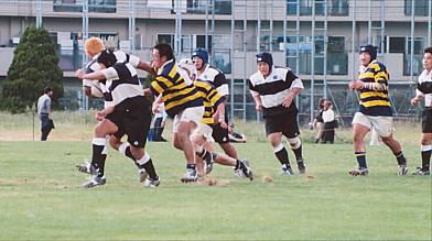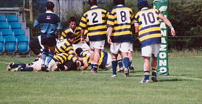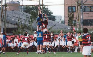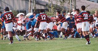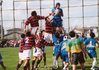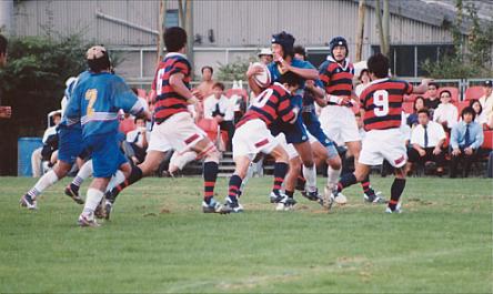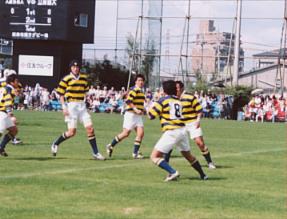 2000年10月1日・花園ラグビー場2グランド 立命館大学(紺・黄)*大阪体育大学白・黒)、京都産業大学(赤紺)*龍谷大学(青)、