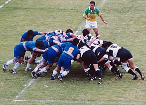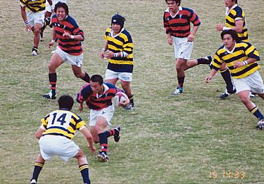 E、立命フロントローをめくりあげる京産スクラム(15:32)。F、京産平田主将の突撃。(14:33)。