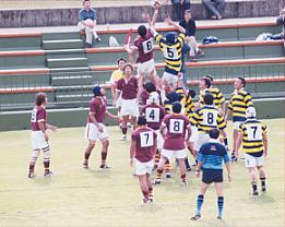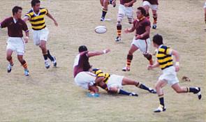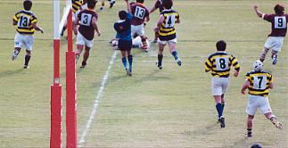 C、タックルを受ける近大・本多選手(13時10分頃)、D(13時26分頃)本多選手のトライ。レフェリーの陰で手だけ見える。